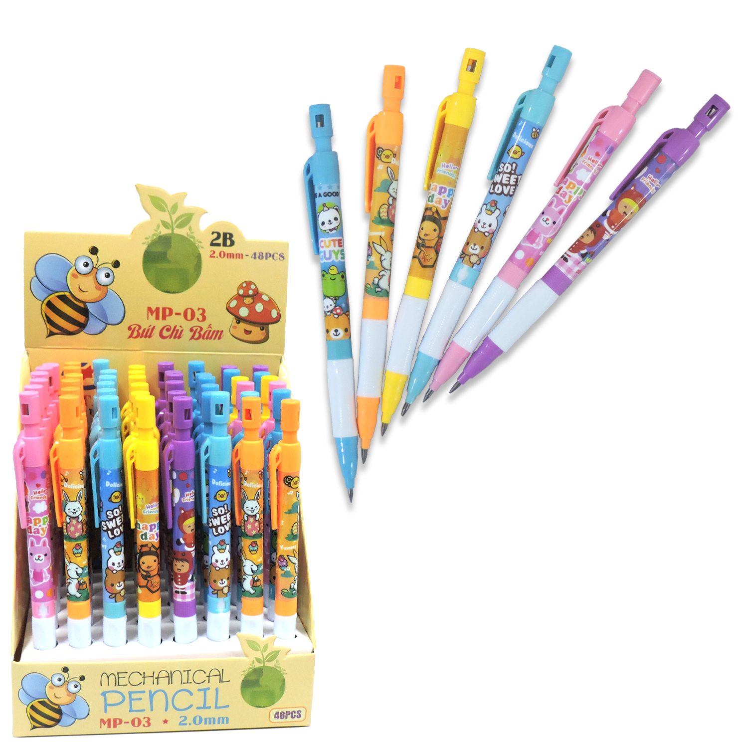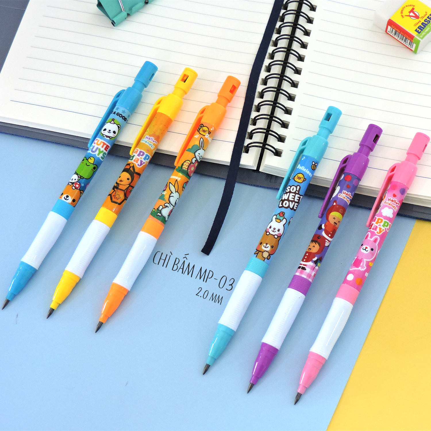 Sản phẩm là dòng bút chì kim (bút chì bấm) thân lớn, được thiết kế đặc biệt với hình ảnh hoạt hình ngộ nghĩnh, rất phù hợp cho học sinh tiểu học mới tập viết hoặc vẽ.