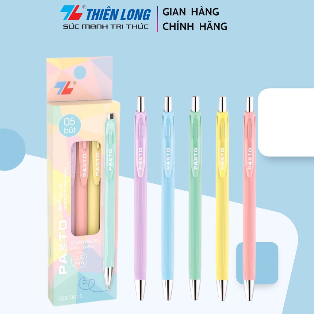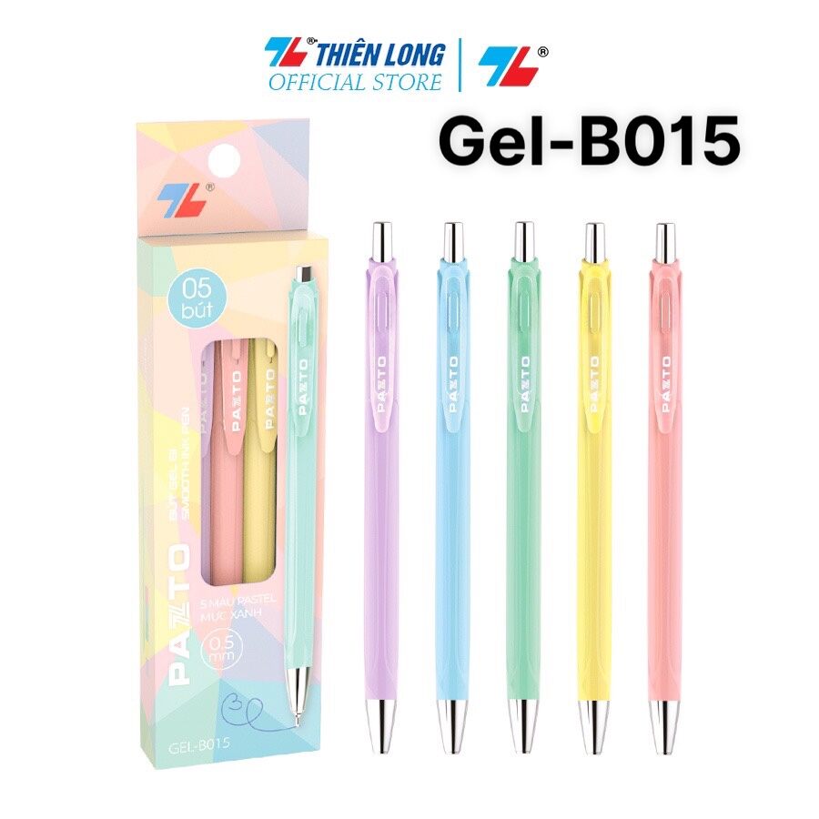 - Thiết kế và màu sắc: Bút gel Thiên Long B015 nổi bật với thiết kế đơn giản nhưng hiện đại, phù hợp với xu hướng hiện nay. Sản phẩm có 5 tone màu pastel dịu mát: hồng, xanh dương, xanh lá, vàng và tím, mang lại cảm giác nhẹ nhàng và thanh lịch.